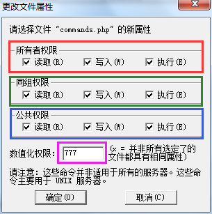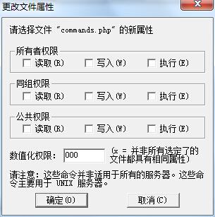 比如我要對commands.php文件進(jìn)行權(quán)限的設(shè)置,我就在FTP中打開文件屬性,可以看到這個文件權(quán)限設(shè)置的界面。下邊給大家說一下每一個選項所代表的數(shù)字。