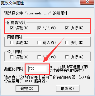 比如我要給commands.php文件設(shè)置所有者權(quán)限為可讀寫,可執(zhí)行,那么就在所有者權(quán)限上全部打勾(如下圖),而在數(shù)值化權(quán)限那里就會顯示“700”