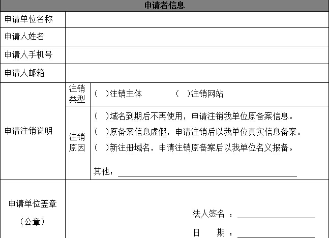 找到了備案中心的客服(我的域名是在這里備案的,所以建議大家在取消備案的時(shí)候,盡量找當(dāng)時(shí)的備案商進(jìn)行咨詢),我說(shuō)明了情況,然后就填寫了一張域名取消備案的申請(qǐng)(如下圖),帶上身份證的掃描件,用傳真一塊發(fā)了過(guò)去。客服說(shuō)她們那里3天以內(nèi)提交給管局,管局5天內(nèi)就可以給取消備案,到時(shí)候會(huì)發(fā)短信和郵件。
