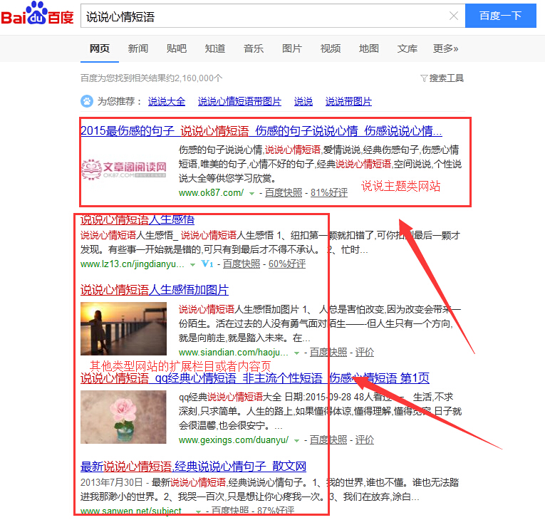 大家可以看到,當我們搜索說說心情短語,整個第一頁都是與說說心情短語相關的內容,但是大家可以注意一下,首頁10個位置,僅僅只有兩個是做的專題網站,網站的內容都是緊密圍繞關鍵詞而撰寫的,而其他網站就并非這樣了,多數都是權重比較高的網站后期進行擴展的欄目內容,雖然這些欄目頁甚至內容頁排名都還不錯,但是如果你像我的瓜澤網這樣做個以這個關鍵詞為主題的網站,還是能夠和這些高權重網站欄目頁競爭的。但是如果你只是一個普通權重的網站,也學他們進行擴展欄目去做,那么你的競爭壓力就要大太多了,而且他們這些很多都是團隊,有專門的編輯負責這些欄目,而你是一個人,當你擴建很多欄目的時候,你會慢慢的感到力不從心。