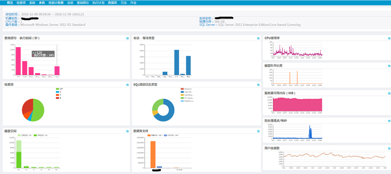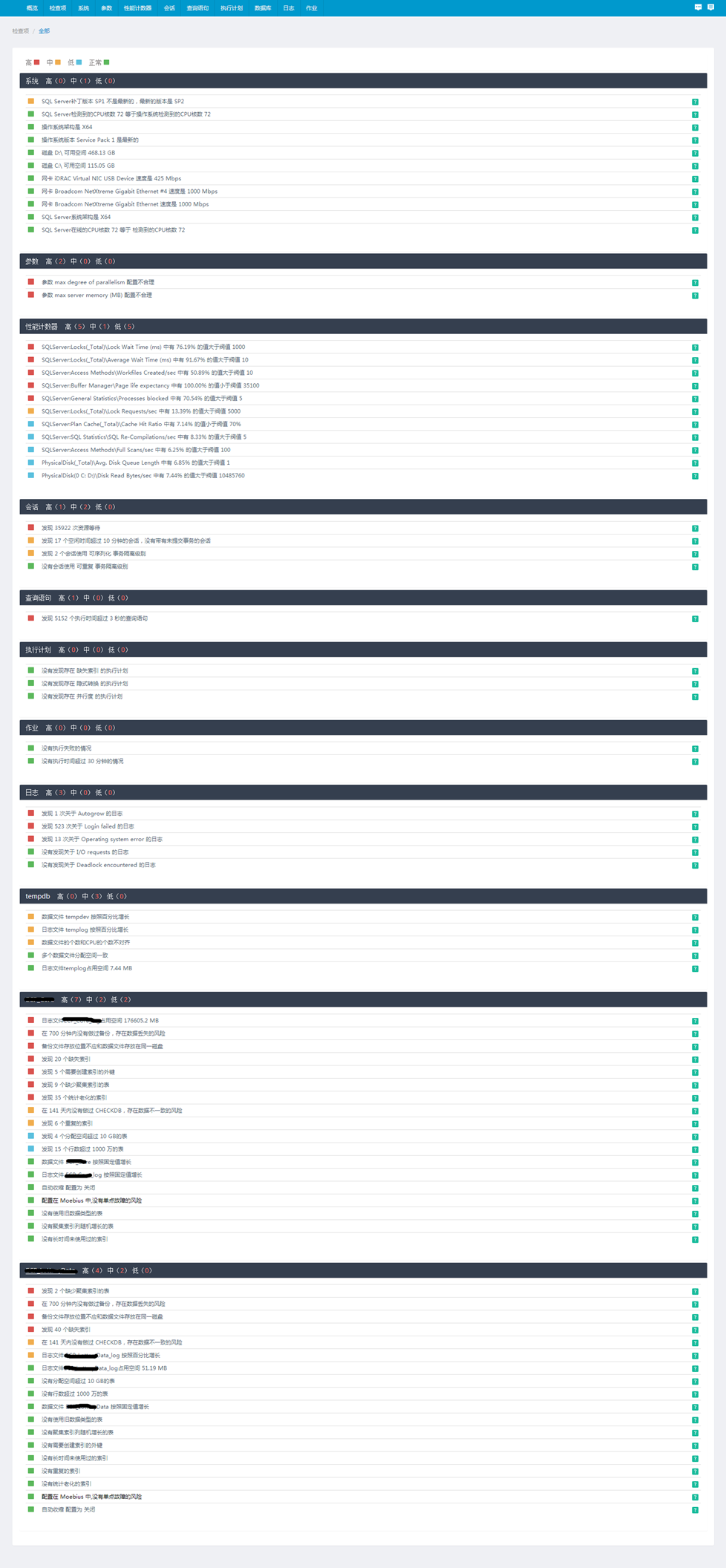 從系統(tǒng)、參數(shù)、會(huì)話、性能計(jì)數(shù)器、查詢語(yǔ)句、作業(yè)、日志、執(zhí)行計(jì)劃、tempdb、業(yè)務(wù)數(shù)據(jù)庫(kù)多方面呈現(xiàn)系統(tǒng)存在的問(wèn)題與隱患。