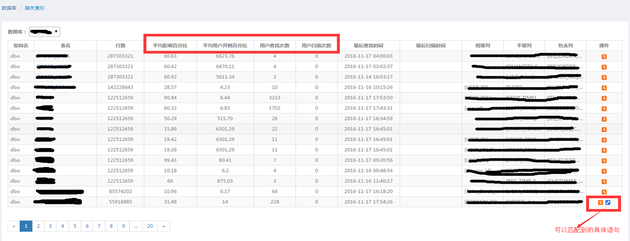 注:并非所有提示的索引都需要?jiǎng)?chuàng)建,根據(jù)【平均影響百分比】【平均用戶開(kāi)銷百分比】【用戶查找次數(shù)】情況綜合評(píng)價(jià),建立系統(tǒng)中缺失的重要索引。并綜合【相等列】【不等列】【包含列】創(chuàng)建包含多種情況的最優(yōu)索引。