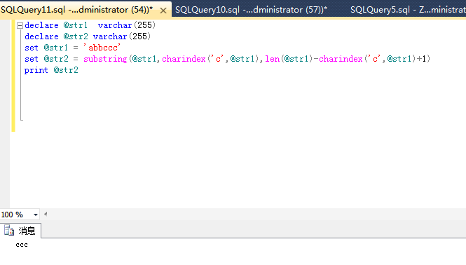 declare@str1varchar(255)declare@str2varchar(255)set@str1='abbccc'set@str2= substring(@str1,charindex('c',@str1),len(@str1)-charindex('c',@str1)+1)@str2