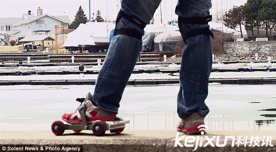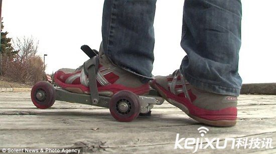 據說這個裝備融滑板車、旱冰鞋、滑板于一體,可以固定在鞋子上,然后用戶就能單腳滑冰了。