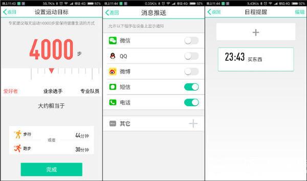 用app設(shè)置運(yùn)動(dòng)目標(biāo)的時(shí)候,這里再一次體現(xiàn)了唯樂app對(duì)運(yùn)動(dòng)方面的用心,一般的智能手環(huán)app,在設(shè)置運(yùn)動(dòng)目標(biāo)時(shí),僅僅只有一個(gè)步數(shù)設(shè)置,而唯樂app將每個(gè)階段步數(shù),用稱呼來分類了,例如業(yè)余選手4000步等,可以讓你更好的設(shè)置運(yùn)動(dòng)目標(biāo)。而消息推送跟日程提醒這個(gè)兩個(gè)功能,在上面我也已經(jīng)做了實(shí)際體驗(yàn)展示,具體體驗(yàn)就是那樣。