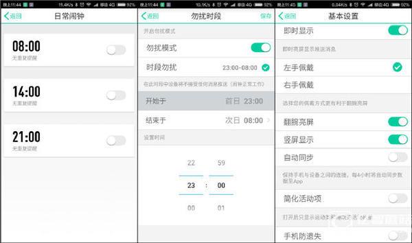 日常鬧鐘,我也測試過,一到時(shí)間,唯樂Now2就是震動(dòng)提醒你,感覺還可以,今早就試了一會(huì),挺準(zhǔn)確的。勿擾模式就是在一定時(shí)間段,不接受消息推送。基本設(shè)置可以設(shè)置佩戴習(xí)慣,還有翻腕亮屏等功能,其中豎屏顯示就是在這里設(shè)置的。