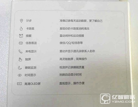 ▲背面是手環的主要功能簡介,除了基本的記步、卡路里、時間顯示功能外,還有消息推送、睡眠監測、來電顯示等功能,這個在下面的功能體驗中會有介紹。