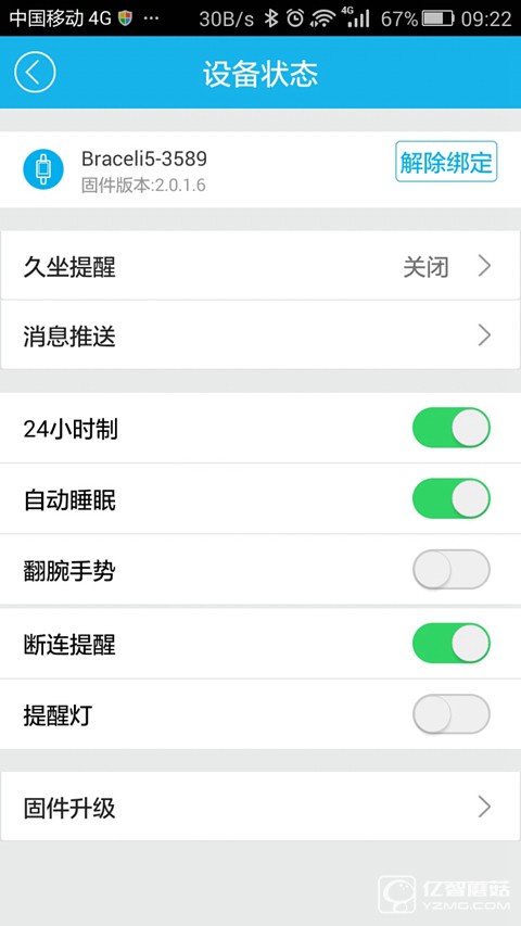點擊app主頁上方的藍牙連接處,進入設備狀態頁面,你會看到些常用設置,比如久坐提醒,這個功能很好,你可以選擇你的工作是運動量比較少還是比較多的,比如坐辦公室你就可以選擇運動量少,那么手環會在下一個整點的半點提醒你,需要注意的是,如果手環記錄到你設置的時間段內走路超過200步,那么下一個半點就不會再提醒你了。