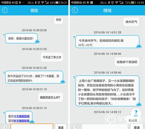 還有一個比較贊的功能,在“埃微健康助手”下方,有個小話筒,點擊進去可以和微哇交流,功能類似于蘋果上的siri,甚至比siri還強大!你可以語音查詢運動步數、睡眠數據等,關于手環的一切你都可以用文字或者語音的形式詢問她,微哇會詳細解答。當然除了這些,你還可以詢問當地的天氣、數學題、日期、講笑話等等,還有,如果你是一只單身狗,你可以盡情的撩妹。