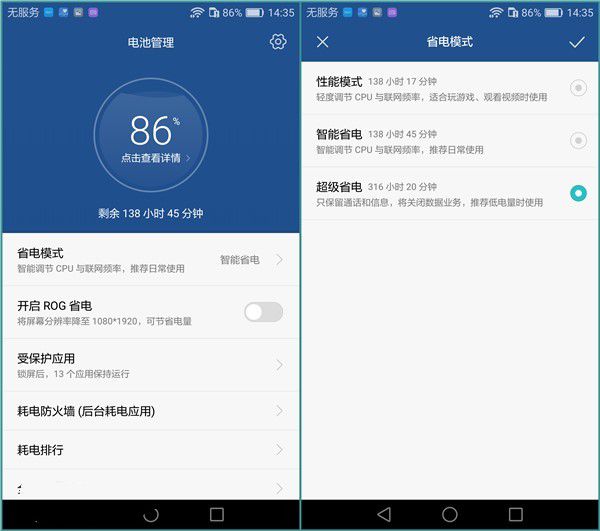 榮耀V8在這方面的表現要強于iPhone6s Plus,首先肯定要感謝其大容量電池,另外也得益于其豐富多彩的省電模式,榮耀一直主張,長續航不等于大電池,而是軟硬件的結合,是大電池與先進智電技術的共同作用。一般情況下,我們正常使用的話常駐在智能省電模式即可,完全不耽誤使用的同時還可以省電,實測玩游戲沒影響呦~~~而超級省電模式一旦激活,那就意味著你可以盡情打電話發短信,就算這樣做也不會太影響最終的續航表現。而如果你確定一天都是電話業務,那么提早開超級省電模式其實也是可以的,保證接下來的電量不被意外損耗。據說超級省電模式還有一個黑科技,就是除電話、短信外,可選擇3個APP開啟使用,如微信、QQ等,但這個得在6月份OTA升級后才能用,到時候想省電還想聊天,選它就對了,值得期待一下~