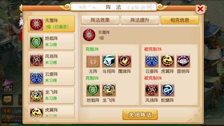 陣法之間存在互相克制效果,尤其在PK時更加明顯,所以在選擇陣法時不但要根據自身職業的特點,同時可以選擇一些克制通用的陣法,如克制天覆陣的飛龍陣、克制鳥翔陣的虎翼陣等等。