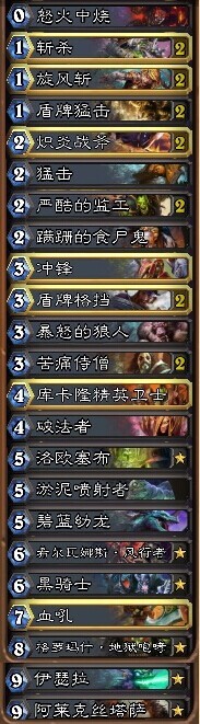 在傳統土豪戰基礎上,加入了一套 怒火中燒、沖鋒、狼人。形成吼爹和狼人的雙沖鋒斬殺核心。去掉的3張牌在不斷調整中,目前是去掉2張鑄甲師1張猛擊。