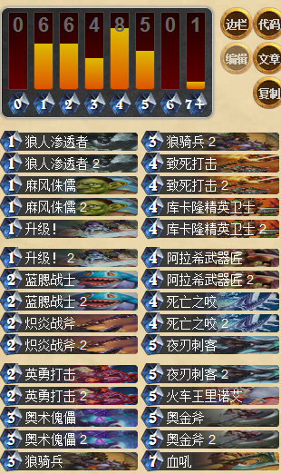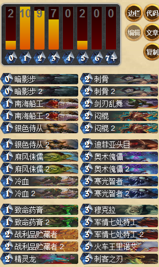 相比于打臉戰(zhàn),T6賊明顯更具有穩(wěn)定性:強(qiáng)力的過牌,AOE和悶棍的解場能力以及更強(qiáng)力的爆發(fā)。是一套不論是天梯還是大賽都有出場率的卡組。操作上也不難于打臉戰(zhàn)士,不同在于T6賊需要不斷地站場過牌找到自己想要的combe然后秒殺對(duì)手,在速度較慢的天梯環(huán)境中有十分不俗的表現(xiàn)。