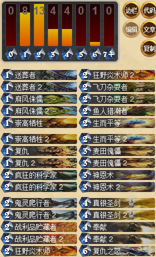 神恩騎的取勝方式相比于上面兩位就顯得規(guī)矩了很多,靠的是站場與解場,在場面、卡差、血量都有優(yōu)勢的條件下穩(wěn)定取勝。這套牌的控場能力可以說強(qiáng)大的連他自己都害怕,只要稍加訓(xùn)練就能很輕易地hold住場面,剩下的就是看對(duì)手掙扎了,不過這套牌也有缺點(diǎn),及缺少爆發(fā),一旦沒有了場面優(yōu)勢也容易被對(duì)方吊打。