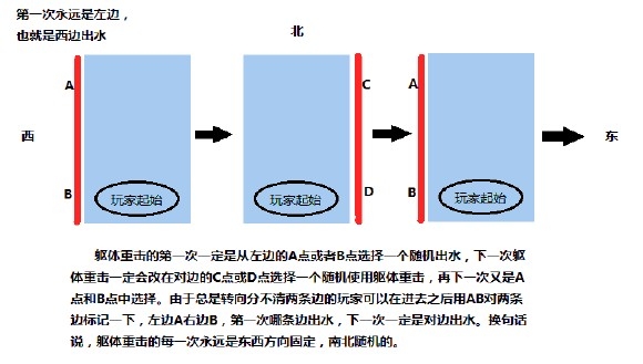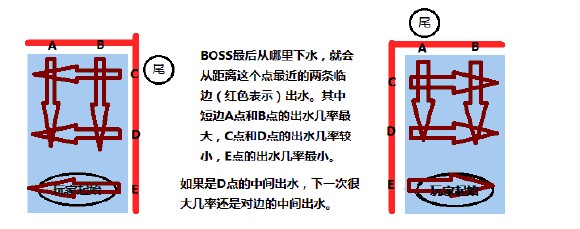 再說一下軀體沖擊,也就是龍車的躲法。軀體沖擊也不是任何地方都會出來的,每次BOSS下水之后如果下一次是軀體沖擊,那么一定會從離尾巴下水的地方最近的兩條臨邊出水,換句話說BOSS最后從哪個點下水,就從離那個點最近的兩條臨邊出水。而且短邊的出水幾率大于長邊的,如果是中間出水,那么下一次很大幾率也是對邊的中間出水。
