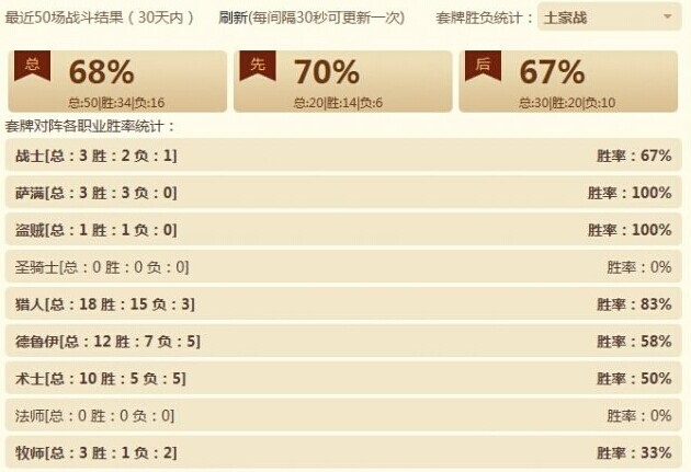 每個(gè)賽季開始的第一天,尤其是0點(diǎn)剛開始,基本天梯都是獵人和動(dòng)物園,這個(gè)時(shí)候用獵人以暴制暴比較不錯(cuò)。不過我都是第二天早上開始打,快攻會相對少一些,所以我一開始用的是牧師,10-20分鐘一局的對局,雖然讓人很累,不過偶爾玩玩牧師也是個(gè)鍛煉口算能力的時(shí)候。到了7級,發(fā)現(xiàn)遇到了坎,所以改用獵人,一路連勝到了5級,但是不知道大家怎么認(rèn)為,我是覺得玩獵人的時(shí)候心里總是很虛,總覺得沒有續(xù)航能力,所以我本人并不是很喜歡用獵人。因此,我5級之后,就開始用土豪戰(zhàn),做一個(gè)安靜的有安全感的美男子。廢話不說,卡組也不是很新,我就介紹介紹我的一點(diǎn)心得,怎么說呢,還是靠吃獵人上分的。