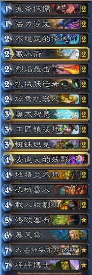 為了應對動物園、薩滿和圣騎的強力鋪場,加入了一張暴風雪,同時也能對抗小德的塞納留斯。比呼啦低一費就多了一分安全,而且很多時候對面鋪的怪并不會很大,暴風雪基本夠用了,另外還有10費的暴風雪火球(安東尼在場)叫殺combo。