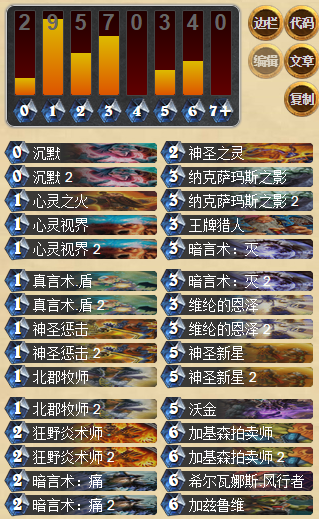 亡語牧師曾經也是風靡一時,相比亡語獵人來說節奏比較慢,如果前期能夠摸到送葬的話應該說是比較順利的,現在送葬被削弱之后幾乎都會替換成其他隨從。筆者作為喜愛牧師這個職業的玩家,對于牧師卡組的信息一直是十分關注的,本次給大家帶來一套國外高玩Reyond的奇跡牧師,卡組如下: