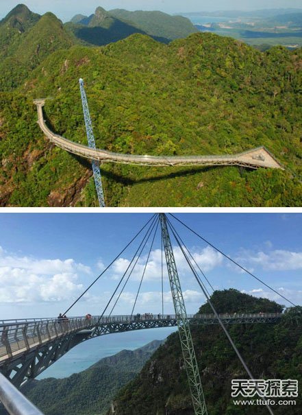 馬來西亞的天空之橋,總長125米,橋形呈圓弧狀,這么個又大又重的“鋼架”只用了一根支柱來支撐,支柱高87米,被固定在山腰,整個橋就這樣最終被“吊”在了海拔687米的高空