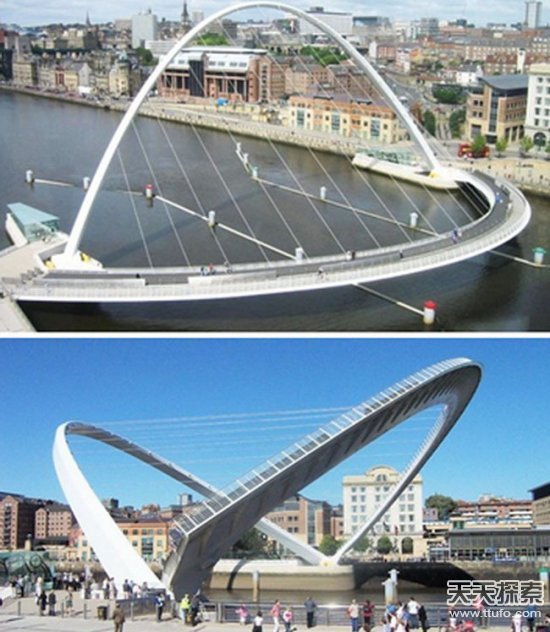 英國蓋茨亥德千禧橋是世界上第一座也是唯一一座擺式大橋,該橋可以通過兩端的壓力揚吸機進行旋轉,以便讓過往的小型船只通過