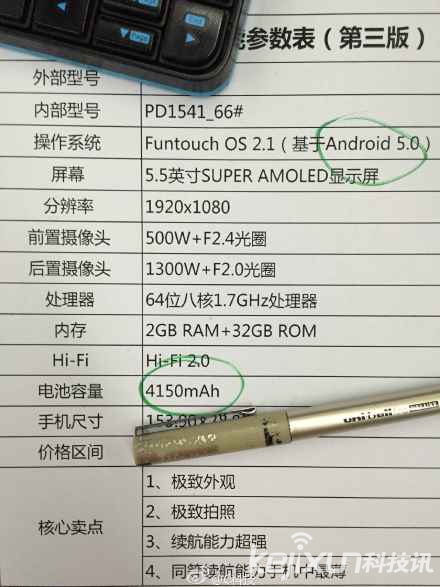該機(jī)搭載了基于Android 5.0深度定制的Funtouch OS 2.1系統(tǒng),擁有分辨率1920x1080像素的5.5英寸AMOLED屏幕,達(dá)到目前主流水平,而4150mAh的電池則是vivo史上最高的電池容量,就算在整個(gè)手機(jī)市場(chǎng)中也可以傲視群雄,看來一直以淺薄的極致外觀征服用戶的vivo,此次也決心在超長(zhǎng)待機(jī)這條差異化道路上試試看,不過這也倒是符合vivo擅長(zhǎng)的極致差異化風(fēng)格。