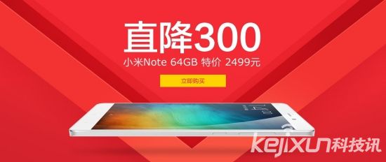 據機鋒網報道,5月14日小米公司官方微博上宣布,小米Note標準版(64GB)移動、聯通雙網通直降300元,調整價格到2499元。用戶無需預約搶購,可通過小米官網、小米天貓旗艦店以及小米商城APP直接下單購買,7天內發貨。降價前10天內成功購買小米Note(64GB)的用戶可領取1張300元現金券。