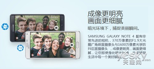 GALAXY Note 4的后置主攝像頭搭載1600萬像素光學防抖(OIS)鏡頭,無論環境照明如何惡劣,都可確保拍攝出清晰鮮明的圖片和UHD(4K級)超高清視頻。370萬像素的前置攝像頭可以拍攝原始分辨率達2560*1440的照片,完全匹配其2K屏幕的顯示,f1.9級別的大光圈,比上一代前置攝像頭增加更多的進光量,拍攝廣角可達90度,并且支持最高達120度的“廣角自拍”功能。