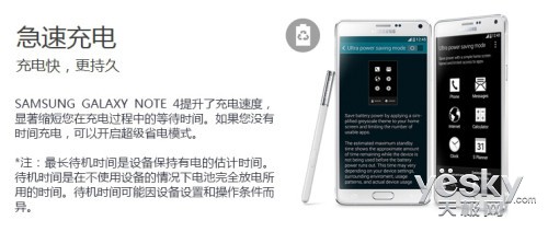 GALAXY Note 4擁有容量高達3000MAH、可更換式的電池,還首次標配了“急速充電”功能,利用原裝充電配件可以快速地進行充電。結合“超省電模式”,GALAXY Note 4完全可以讓用戶對日常使用中的續航毫無顧慮。