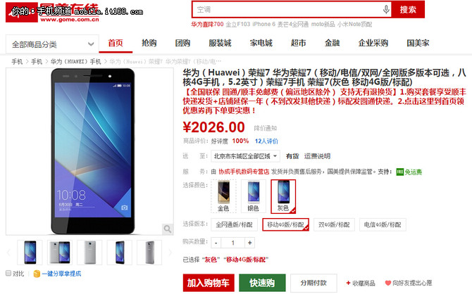 榮耀7全網(wǎng)最低2026元 馬上原價(jià)不用搶