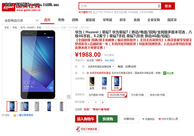 直接跌破官網價 榮耀7現貨1988元