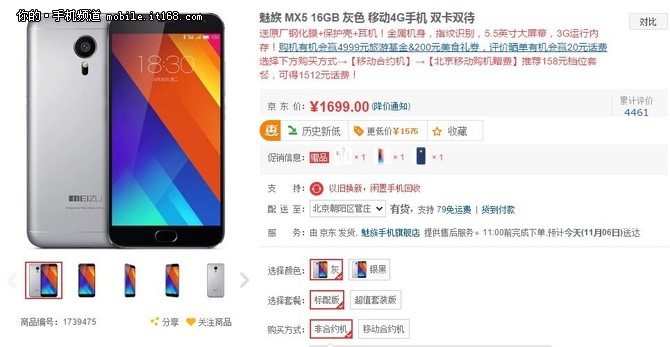 京東商城:魅族MX5移動聯通雙4G版 1699元 ,,