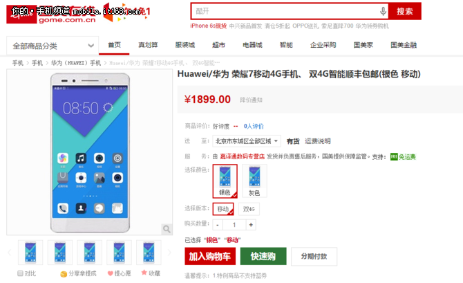 移動4G版:跌破官網(wǎng)價(jià) 全網(wǎng)最低 金屬機(jī)身+指紋識別+指靈鍵 榮耀7 1899元 ,,