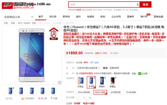【IT168什么值得買】由于種種原因在手機飛速發展的現在,電信用戶仍然有種深似海的感受,不少不錯機型的電信版還需要久等,而電信版的手機相比移動/聯通版也要貴上一點兒。例如具有指紋識別功能、采用金屬機身并且新增“智靈鍵”的榮耀7電信版,在官網華為商城原價2199元但是需要搶購,而在京東商城現貨也加價至2399元的價格。現在我們意外地在國美在線發現電信版榮耀7現貨1899元包郵并送延保等大禮包,目前的活動價已經是歷史全網最低價,較為適合近期有換機需求的電信用戶。