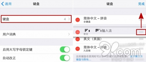挑你最常用的鍵盤,拖放到最上面,再點“完成”,以后它就默認出現在第一位啦。隨便打開一個需要打字的應用都會首先顯示這個默認鍵盤噢!