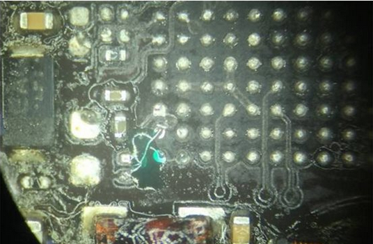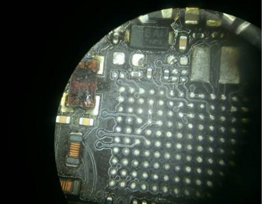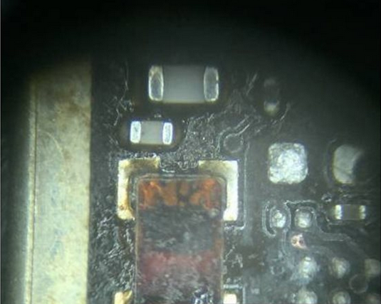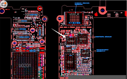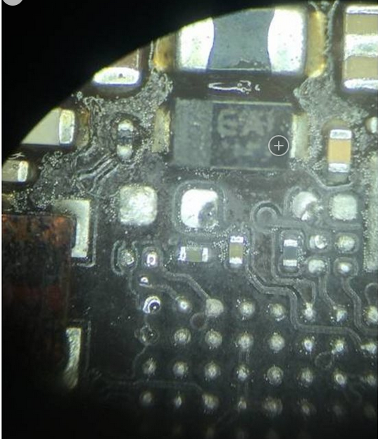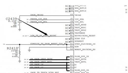蘋果6P于2014年發布,至今快兩年了,很多6P摔過之后會出現觸摸失靈,并且屏幕上方會閃白條。其真正的原因就是觸摸IC U2402虛焊或者斷線。如果重置芯片不行,或者重置芯片能用,過段時間又不能用的那就是焊盤有斷線了。由于維修時拍未下照片,所以就拿個廢板做演示了。通過打阻值發現,焊盤M1腳阻值偏大,在后來的維修中發現,這個焊點非常容易出問題。如果是UMT的板子,那么這個焊點基本會掉,其他板子也是處于非斷不斷之間,所以有些機子重做IC用一段時間故障依舊,就是這個原因了。那么要徹底解決這個問題,就需要飛線了。最后查詢圖紙發現M1腳的定義是顯示觸摸同步信號。