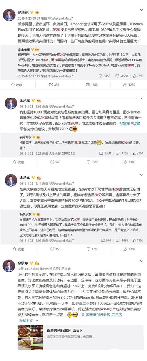 其實對比下余承東2015年和2016年關于2K屏幕的評論就能得出結論,2015年啥處理器最火?驍龍810啊!看看小米Note頂配版就知道這種搭配是多么災難,也難怪雷布斯今年學乖了,哪怕用上改進明顯的驍龍820也只是帶1080P屏幕。另外余承東依然堅持6英寸以下屏幕1080P分辨率就足夠的言論,只不過這次被推出來的代表由iPhone 6 Plus換成了iPhone 6s Plus。
