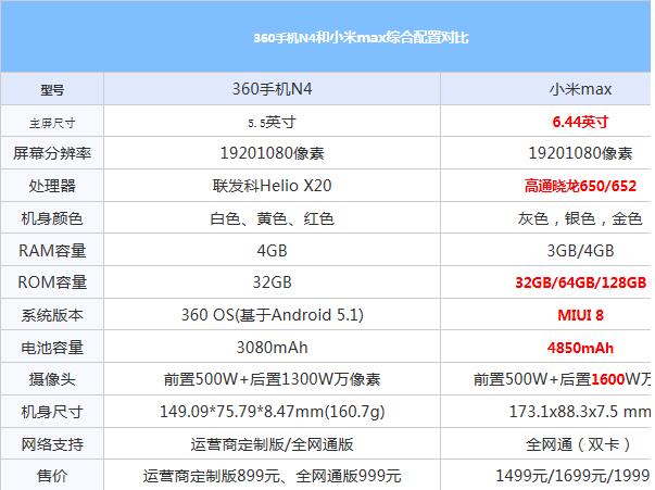 360手機N4和小米max綜合配置對比