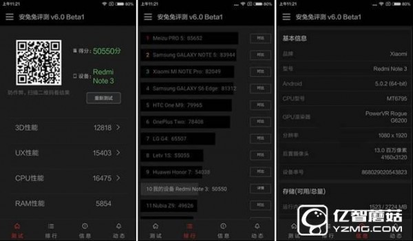 通過(guò)最新版安兔兔V6.0跑分軟件測(cè)試后,我們不難看到紅米Note3安兔兔跑分成績(jī)?yōu)?9999分,算是達(dá)到了5萬(wàn)分,處于搭載helio X10處理器手機(jī)跑分的較為領(lǐng)先的水平,能夠滿足日常的基本應(yīng)用以及流暢的應(yīng)付一些較大型的大型游戲。
