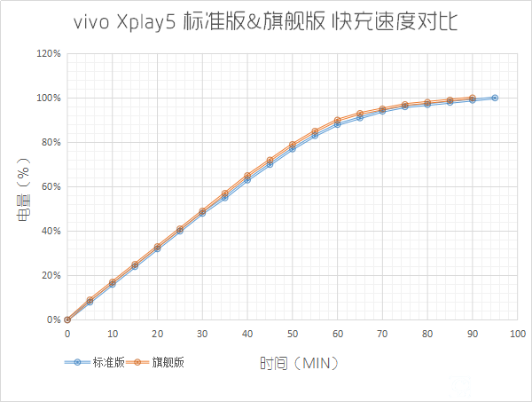 可以看到,兩部手機的充電速度都不相上下,雖然這也是預料之中的結果,但相比普通手機的充電效率,vivo Xplay5的充電速度還是要快很多,只用了30分鐘的時間,就能將手機電量充滿將近一半,這非常滿足用戶在緊急時間的充電需要。完全充滿需要將近90分鐘左右時間,這個用時在目前擁有閃充技術的旗艦手機中,是屬優秀行列。