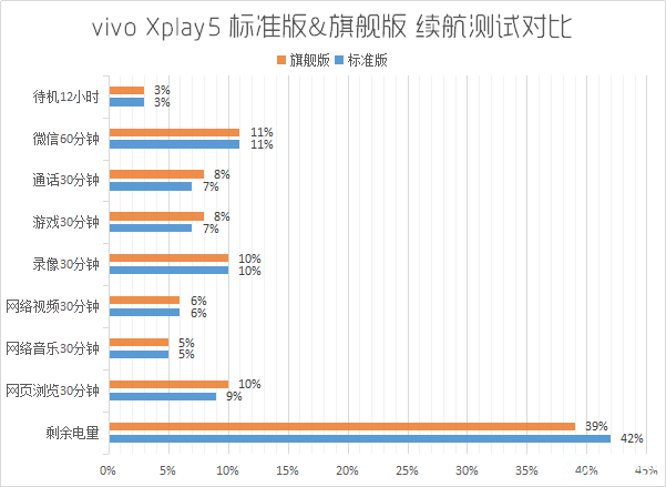 我們再來看看續航,旗艦版Xplay5加入了更強勁的系統核心,帶來有超強的處理能力,讓用戶能夠得到更好的用機體驗。相對的,在耗電量應該會有所增加,通過對兩部手機進行續航測試,我們得到了以下數據。