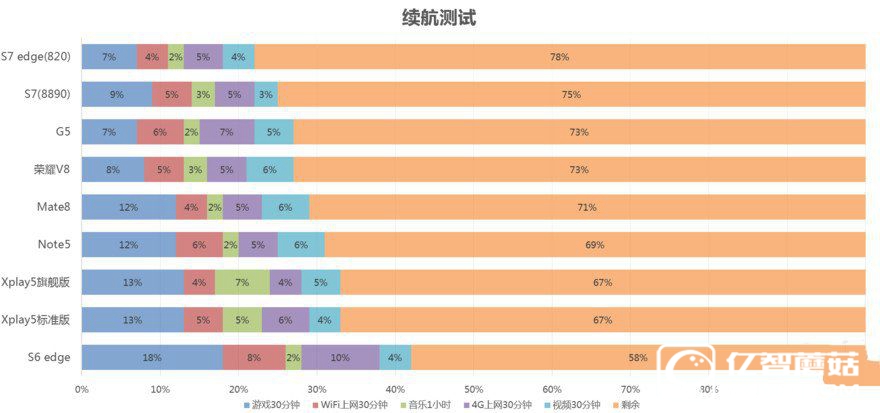 值得注意的是,Xplay5旗艦版因為有暴力的音頻堆料,所以音樂播放環節耗電比普通機器要大,甚至比標準版還要高2%。但其在上網環節更加省電,導致最后成績相同。如果拋除音頻部分的額外耗電,Xplay5旗艦版的續航成績會在LG G5/榮耀V8和Mate8之間,表現還不錯。