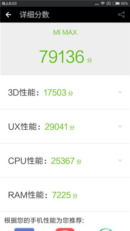 跑分結(jié)果雖不能完全代表性能,但7萬9的跑分成績來看,小米Max應付日常的上網(wǎng)、播放視頻和游戲(有一些游戲會出現(xiàn)不兼容的狀況)是完全夠用的。當然,拋開中規(guī)中矩的性能,最令人滿意的是小米Max的電池續(xù)航。