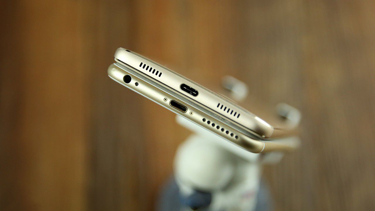 底部的設計上,榮耀V8的設計布局非常對稱,type-c接口在最中央,兩邊的開口位置非常規整,做工看著也非常不錯,沒有螺絲的設計也讓整體感大大增強,相較之下,iPhone6s Plus的優勢可能還是在于所有開孔(除了lightning接口)都是圓形帶來的那一絲美感吧。