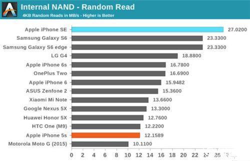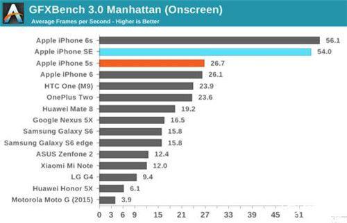 在這個測試中iPhone SE的表現也很不錯,奇怪的是iPhone 6s的分數低于iPhone SE,AnandTech無法確定這是因為驅動器不同導致的還是因為其他的什么原因。不過iPhone SE和 iPhone 6s的分數在測試中是最高的,是iPhone 5s的三倍。