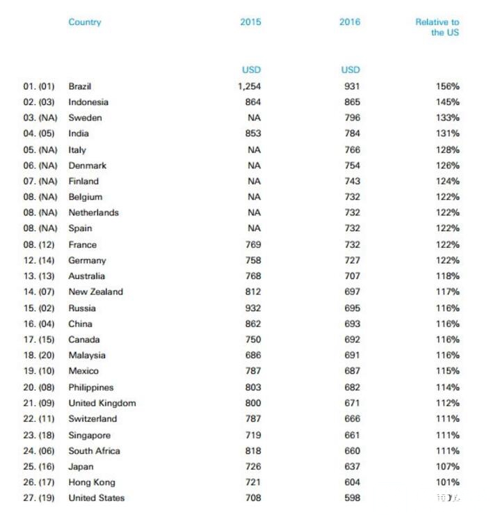 數(shù)據(jù)顯示,相對(duì)于iPhone賣的最便宜的美國,大多數(shù)國家iPhone的溢價(jià)都在10%-20%左右,但有些國家iPhone卻貴得離譜。舉例來說,巴西成了iPhone賣的最貴的國家,其售價(jià)達(dá)到了930美元,而同款機(jī)型在美國600美元就能買到。