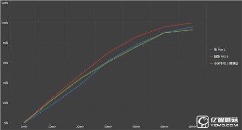 從圖表中我們可以看到,在60分鐘時,魅族PRO6已經完成了充電過程,而小米手機5尊享版和樂Max2基本充到95%上下。考慮到魅族PRO6的電池容量最小,為2560mAh,所以率先完成充電也是情理之中。小米手機5尊享版電電池容量為3000mAh,樂Max2電池容量為3100mAh,結合圖表可以判斷樂Max2在快充方面略勝一籌,而小米手機5尊享版和魅族PRO6的充電效率基本相當。三臺旗艦機型在快充方面的表現都較為優秀,在10分鐘時都已經充到了20%左右的電量,日常應急足夠了。