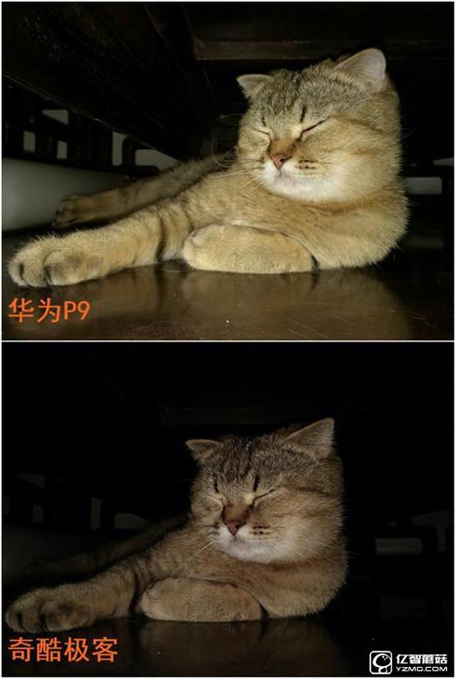 放大至100%之后,和之前的表現不同,華為P9在貓毛上的細節不及奇酷極客,后者的細節更加豐富,但暗部有明顯的涂抹痕跡。