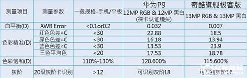 根據實驗室的數據,華為P9的白平衡偏離值為0.032、紅綠藍色差中紅色色差數值最大,奇酷旗艦極客版的數據則是0.007,三色中偏藍。雖說兩者數據都在可以接受的范圍內,特定情況下拍出來還是有明顯區別的。