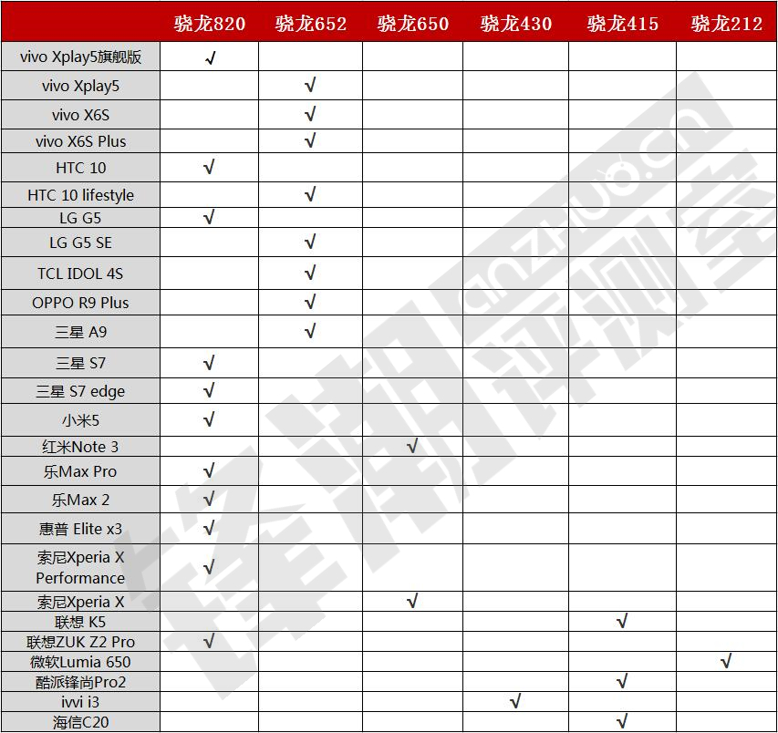 如上圖所示,這就是16年前四個月Qualcomm旗下6款最新最熱門的處理器所搭載的機型一覽表。旗艦級別有驍龍820和驍龍652兩款處理器加持,中高端級別則交給驍龍652和驍龍650把關,中端市場則繼續由上年年底開始發力的驍龍616和驍龍617看守,中低端市場則留給驍龍430、驍龍415和驍龍212開疆拓土。