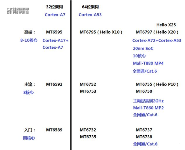 作者先將32位架構和64位架構的處理器楚河漢界劃分開來,在32位架構時代,Cortex-A7架構是聯發科摯愛。而在64位架構時代,Cortex-A53架構成為了新寵。當然每個時期頂級的處理器依然會采用更高能效比的核心,例如32位時期的Cortex-A17和64位時期的Cortex-A72。